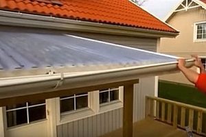 На лобовую доску в передней части козырька крепятся специальные кронштейны, в которые устанавливается водосточный желоб. Желоб соединяется с трубой водостока, отводящей воду в ливневую канализацию или просто на грунт подальше от стен дома.
