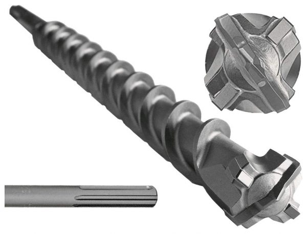 - SDS—Plus – стандартный тип хвостовика. Его диаметр варьируется от 10 до 40 мм. Система крепления представляет собой четыре проточки (две направляющих и две фиксирующих). Длина изделий такого типа – от 110 мм до 1 метра. Применяются в ручных перфораторах;
