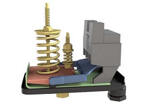 И вот важный момент – кинематическое соединение качающейся платформы с коромыслом. Это выполнено с помощью мощной пружины (поз. 10). «Геометрия и физика» этой пружины таковы, что она обеспечивает мгновенную смену позиции коромысла при перемещении платформы. Например, платформа плавно опускается, и в определённый момент коромысло резко проскакивает вверх, замыкая контактную группу.