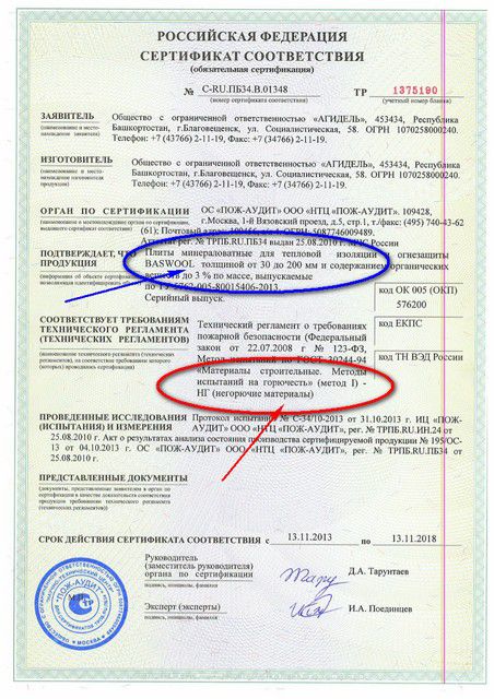 - Важнейшее качество материала – его огнестойкость. Для базальтовой ваты «Басвул» не страшны экстремально высокие температуры, поэтому некоторые типы выпускаемых плит имеют прямое целевое предназначение – противопожарная и тепловая защита строительных конструкций. Немногие современные утеплители могут «похвастаться» высоким классом пожаробезопасности – классификация «Г1» или «Г2» для них уже считается достижением. А вот у базальтовых плит «Басвул» — официально подтвержденный соответствующим сертификатом класс «НГ» — материал абсолютно не горючий.